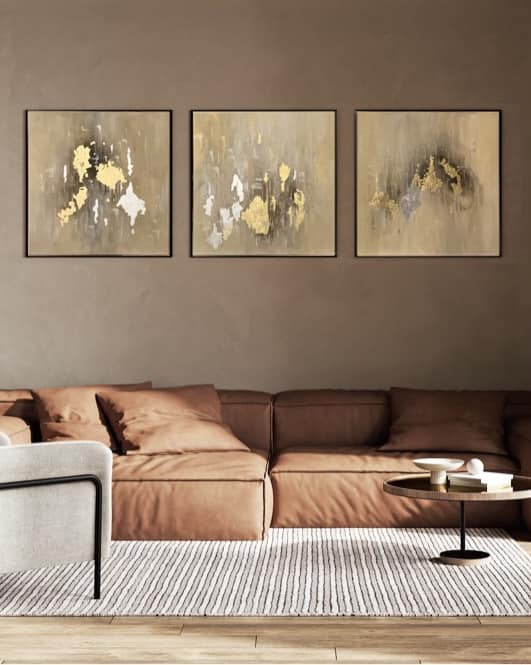 3 darabból álló, 60×60-as vászonra készült, magas minőségű akril és olajfesték,  arany és ezüst metálfólia, arany pigmentpor, akril gél.