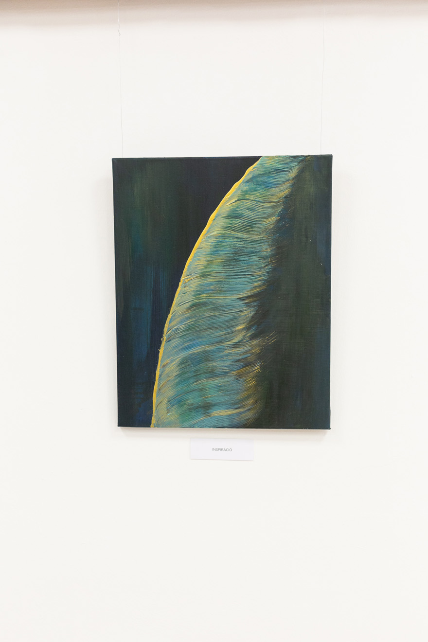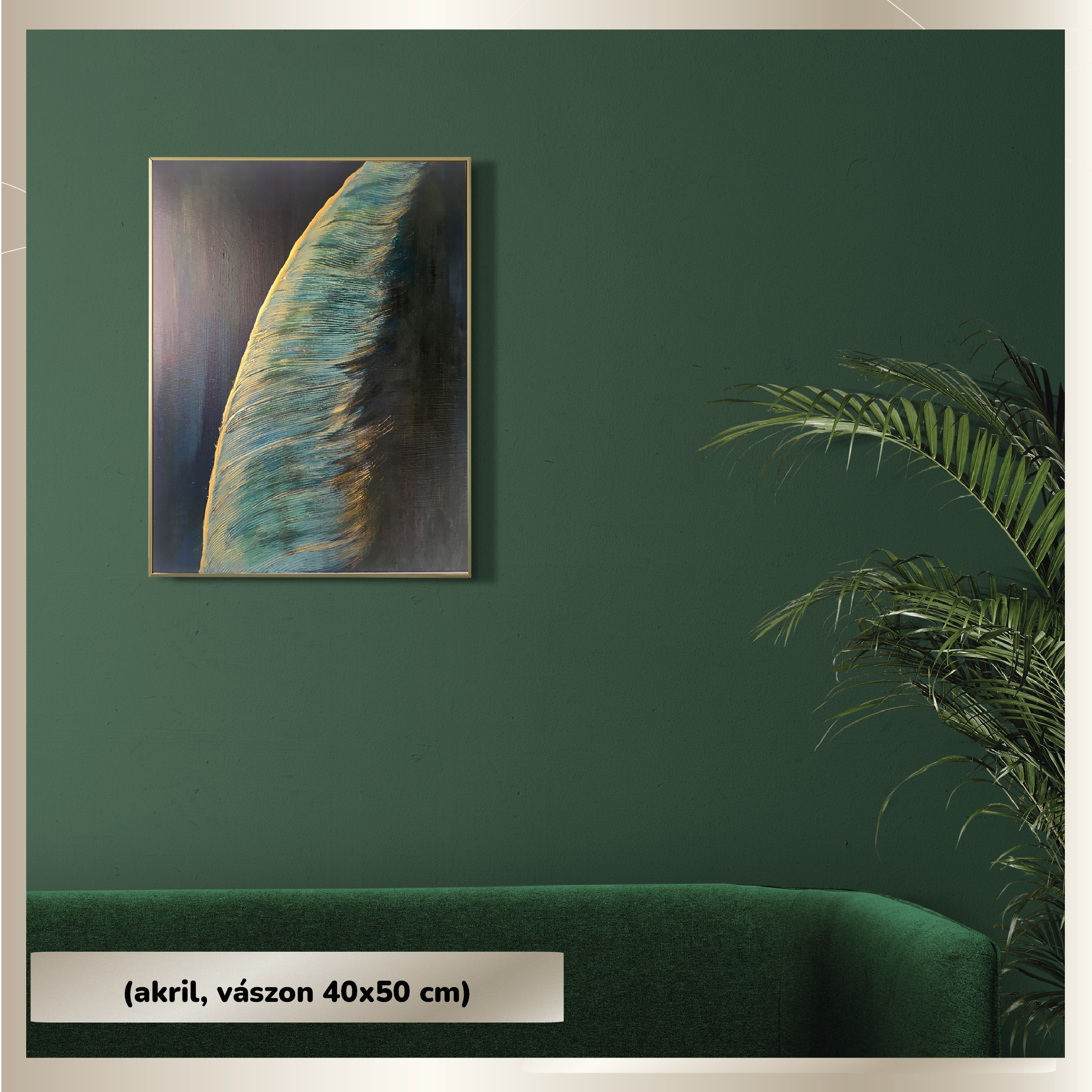 A sötét háttéren – melyen a kék, és a zöld számtalan árnyalata átsejlik – a 3d hatású, gazdagon texturált, türkiz és persze az elmaradhatatlan arany színekben ragyogó toll a hullámzó vonalaival – ezt ez ezerarcúságot szeretné megmutatni.